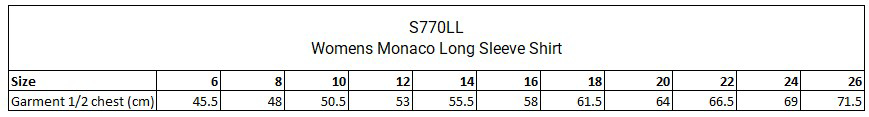 Ladies Monaco Long Sleeve Shirt Chart